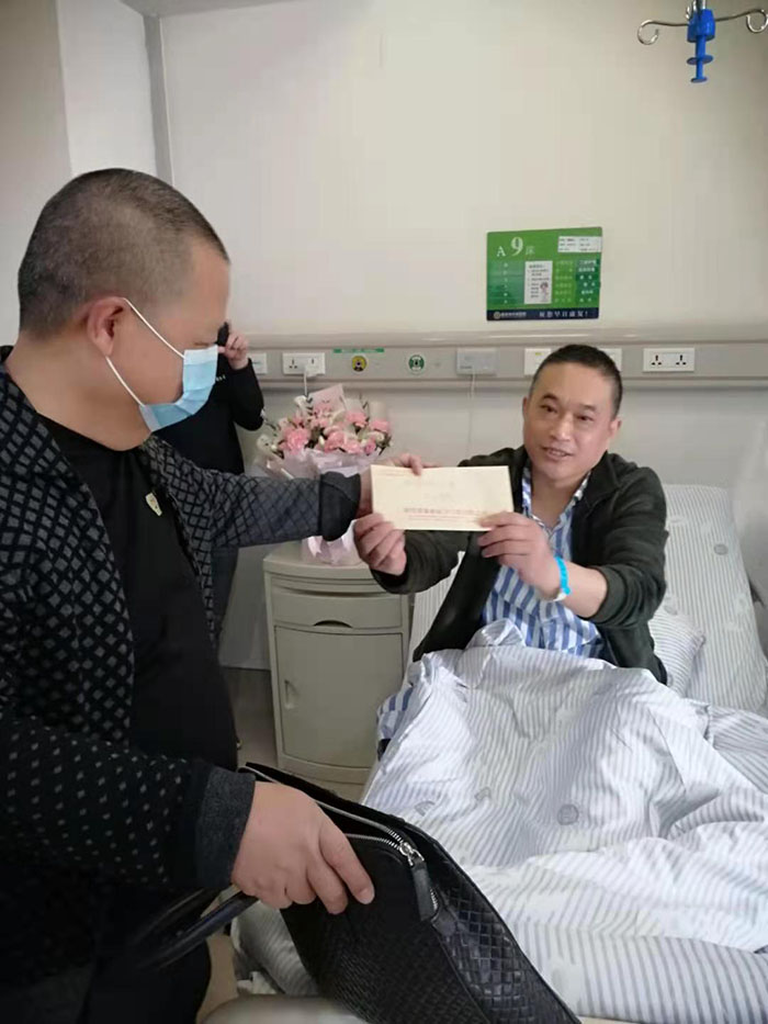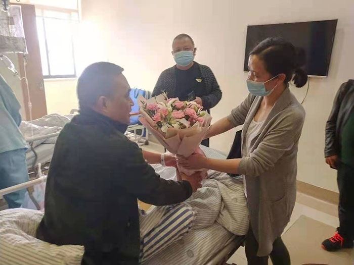 強(qiáng)波電力公司董事長(zhǎng)孫波帶領(lǐng)企業(yè)員工看望慰問(wèn)生病住院?jiǎn)T工潘國(guó)禮